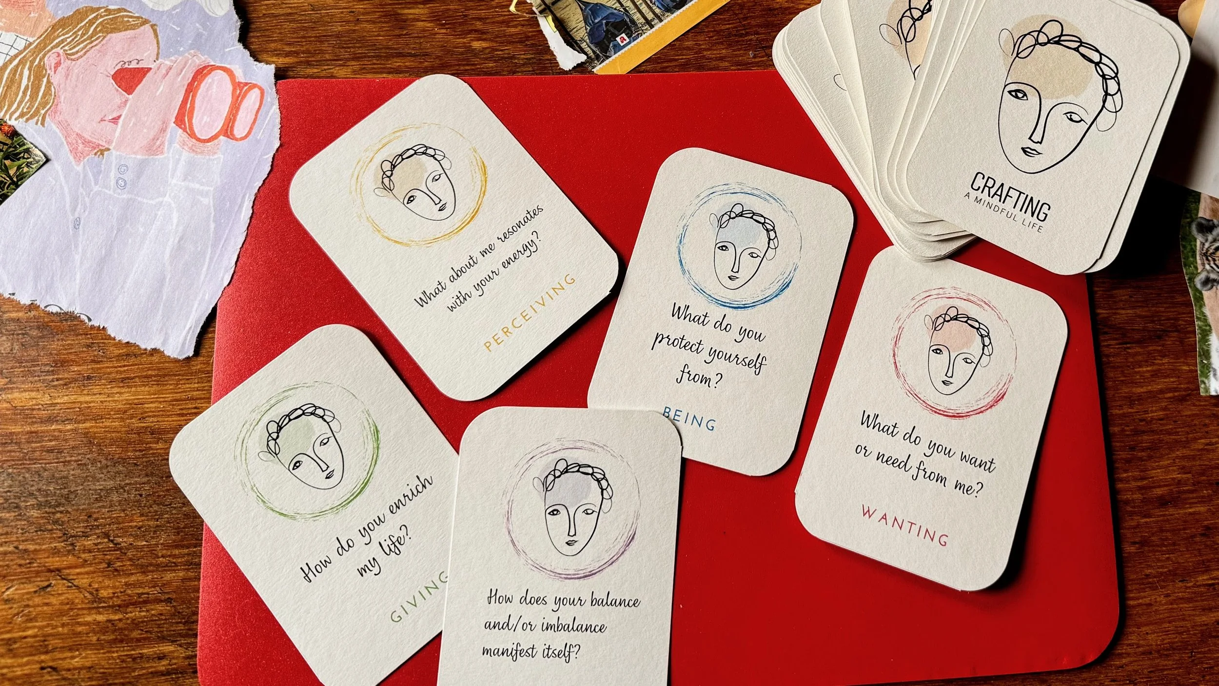 Discover the Inquiry Deck, a set of 42 cards created to deepen your reflection on your SoulCollage® creations. By stepping through the portal into your inner landscape, you can access its wisdom through six colour-coded perspectives: Being, Wanting, Giving, Feeling, Perceiving, and Balance. The Inquiry Deck supports you in building a deeper connection with your soul.